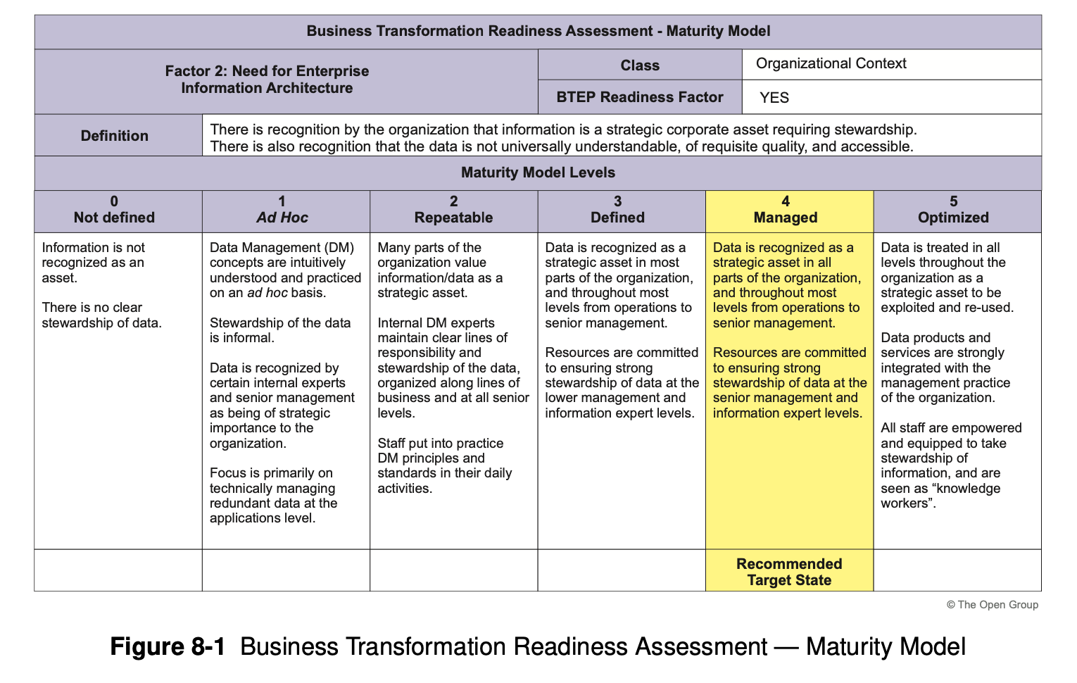 For example, if the "IT capacity to execute" factor is rated as low, the factor should ideally be at "high" to realise the Target Architecture Vision. An intermediate target might be useful to direct the implementation. Maturity models are excellent vehicles to guide this determination.