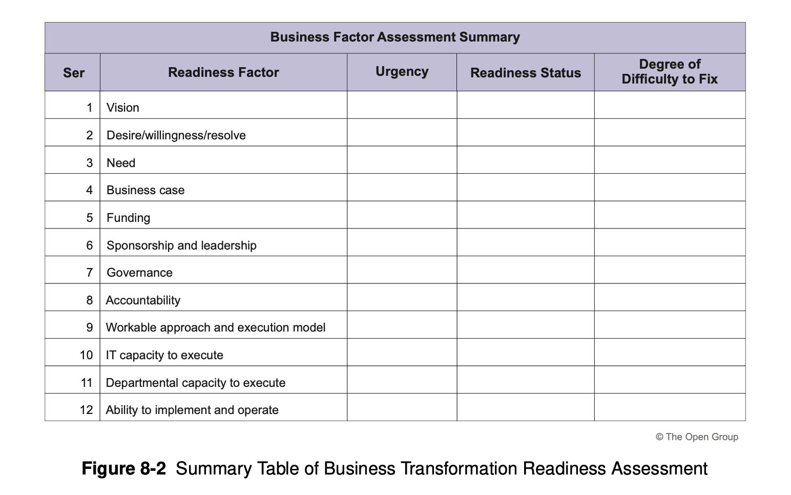The readiness factors assessment will be a living document and during the migration planning and execution of the Transition Architectures, the business transformation activities will play a key role.